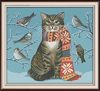 Kit de broderie au point de croix, motif chat et oiseaux, idéal comme cadeau de Noël, estampillé ou compté (chat compté)